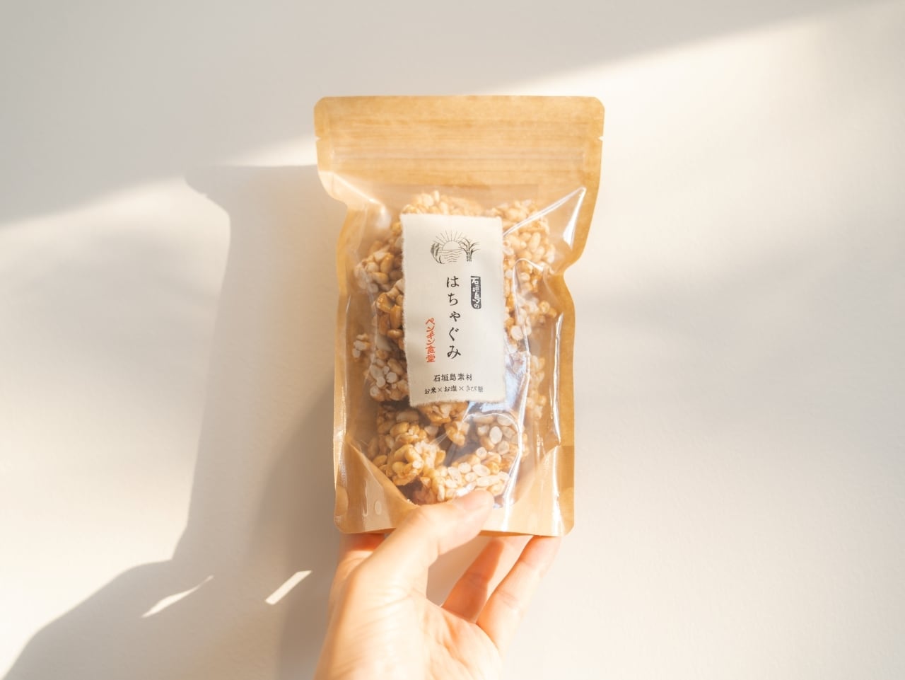 石垣島産のお米、砂糖、塩で作られたポン菓子「石垣島のはちゃぐみ」。